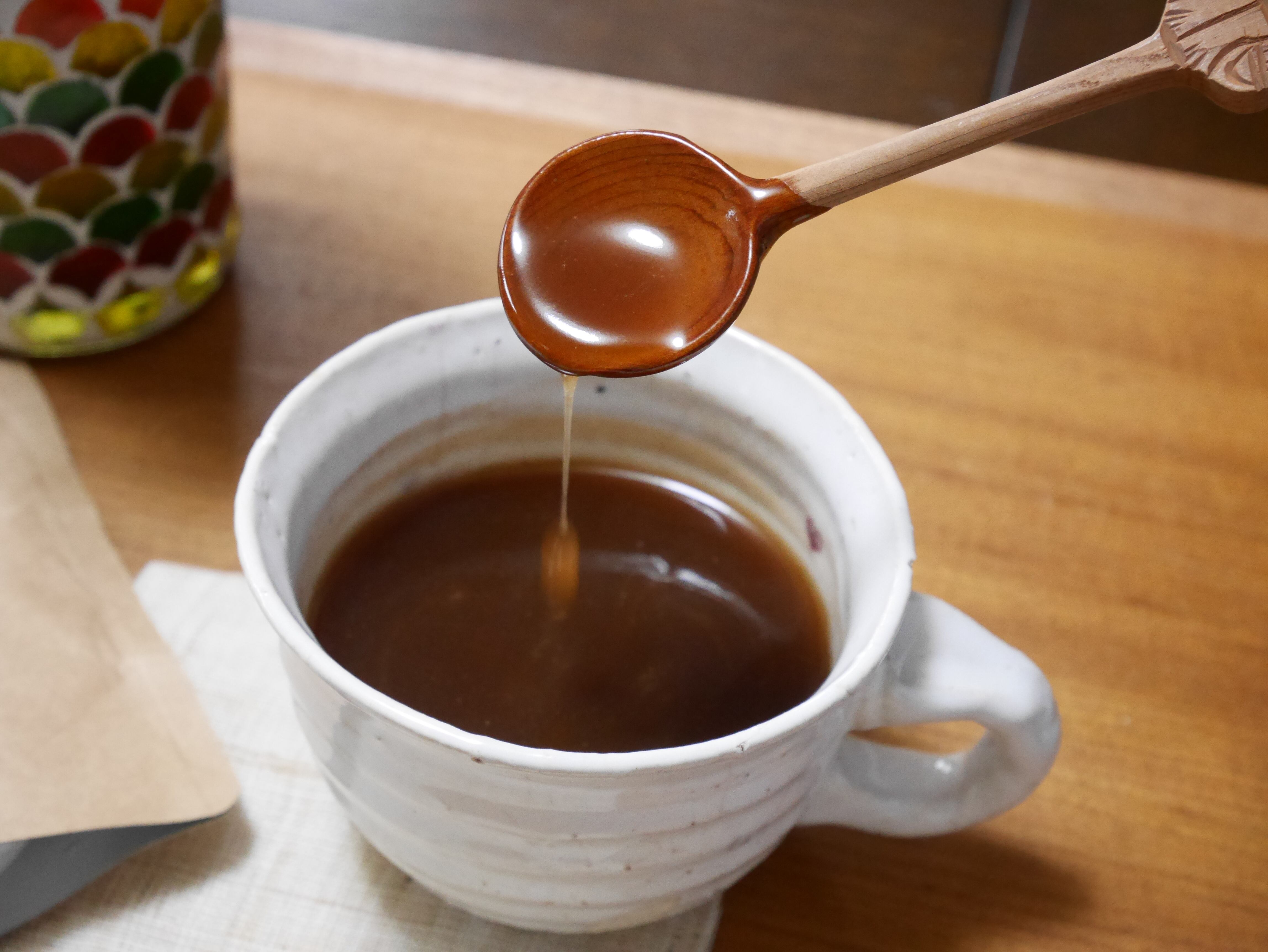 1、あらかじめ温めておいたカップに、大さじスプーン山盛り一杯入れてください。濃い目がお好きな方は、お好みでもう少し加えても美味しいです。