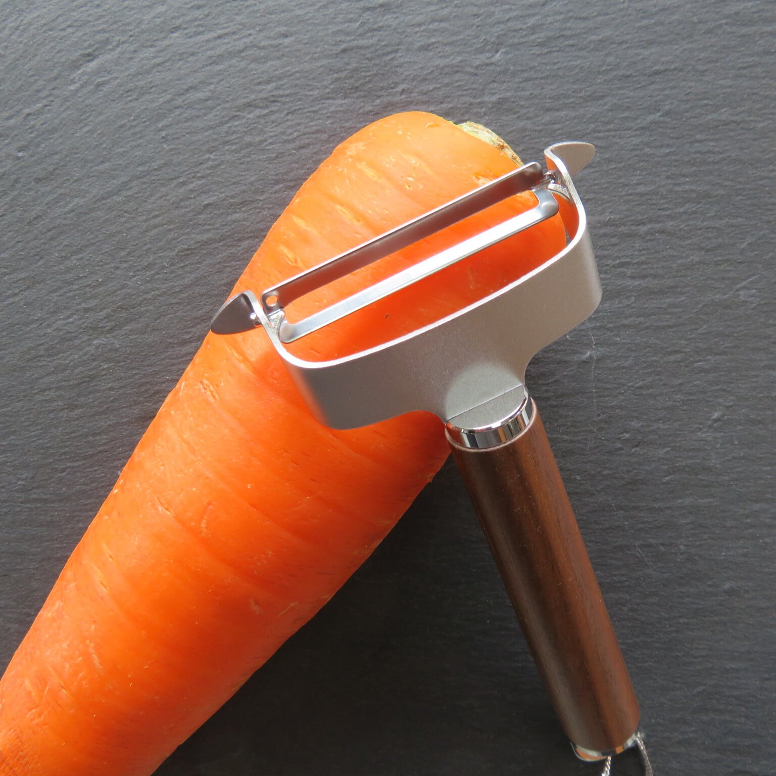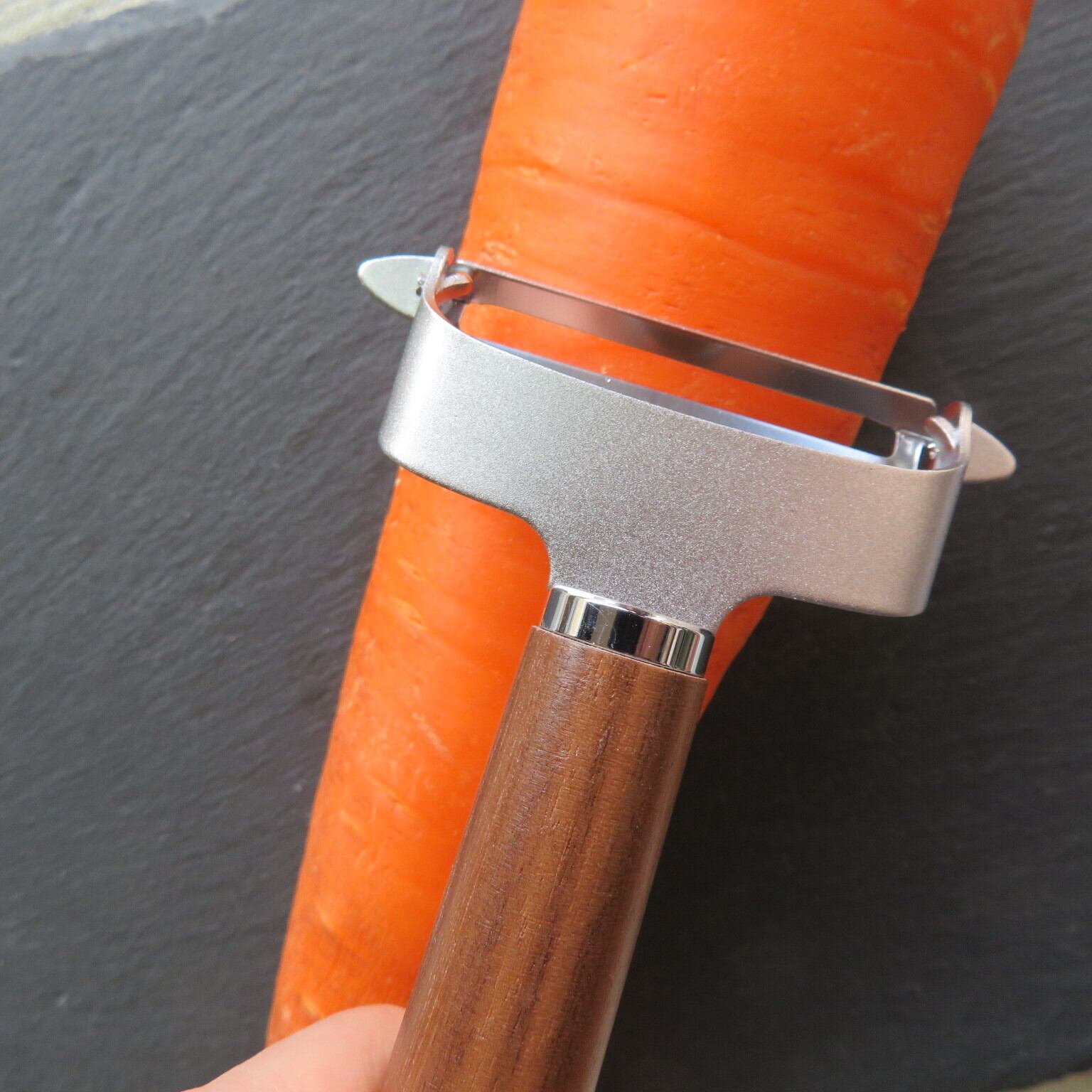 刃の部分は錆びにくく、軽い力で皮がむけるステンレスでできており、柄の部分は優しい質感の天然ウォールナット材を使用しています。1本1本異なる木目が他にはない愛着のあるキッチンツールになります。